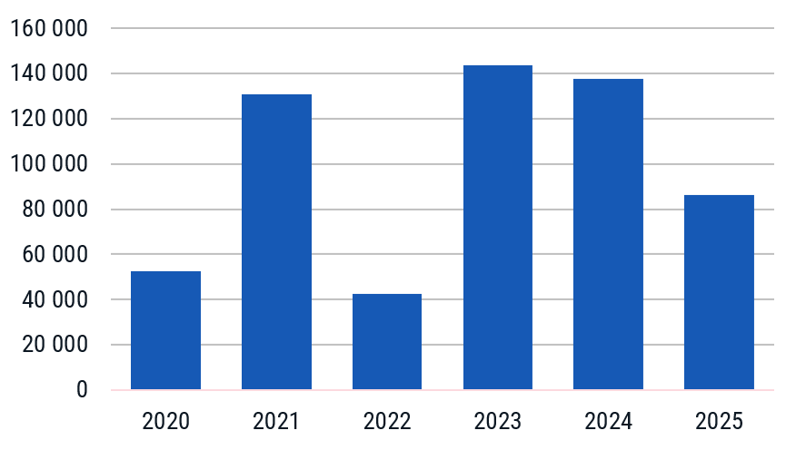 Интересно, что средняя площадь сделки и медианное значение показали разнонаправленную динамику по итогам 2025 г. по сравнению с 2024 г. Медианное значение указывает на то, что в 2025 г. половина сделок была площадью менее 336 кв. м