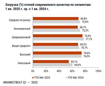 Согласно аналитическому отчету Commonwealth Partnership (CMWP) #MARKETBEAT, за 1 кв. 2025 г. Загрузка гостиниц в Москве накопленным итогом составила 69,8%, что на 2,2 пп. меньше, чем за аналогичный период 2024 г.